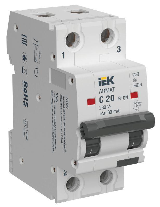 - Выключатель автоматический дифференциального тока 2п C 20А 30мА тип A АВДТ B10N ARMAT IEK AR-B10N-2-C020A030