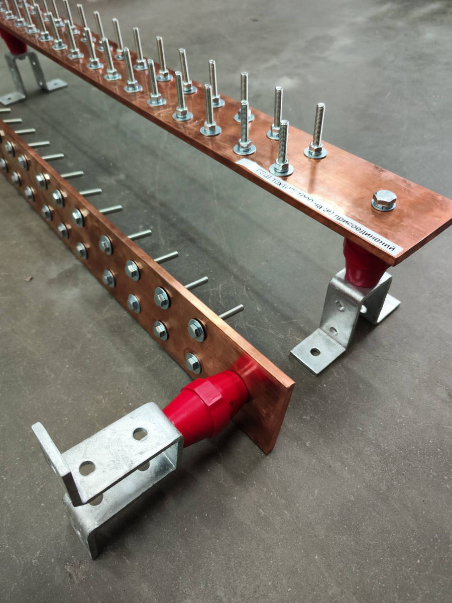 - Главную заземляющая шина (ГЗШ) 1050 мм2 (10х100) на 30 присоединений М8х60 для монтажа на стен